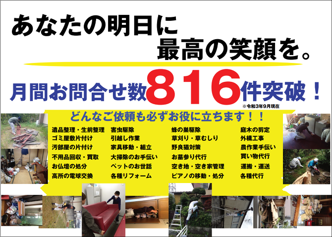 2, 優良事業所に認定当社では全国30社に1社のみ選ばれる〈優良事業所〉に選ばれております。また、遺品整理協会から地区統括会員として選定されている便利屋業者となっております。