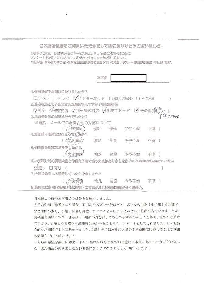 昔からある婚礼家具やベッドなどを移動してもらいました。とても大きな家具でしたが力持ちなスタッフ2名がスムーズに運び出してくれました。まだまだ頼みたいことは山ほどあるのでこれからも末永いお付き合いをよろしくお願いいたします。